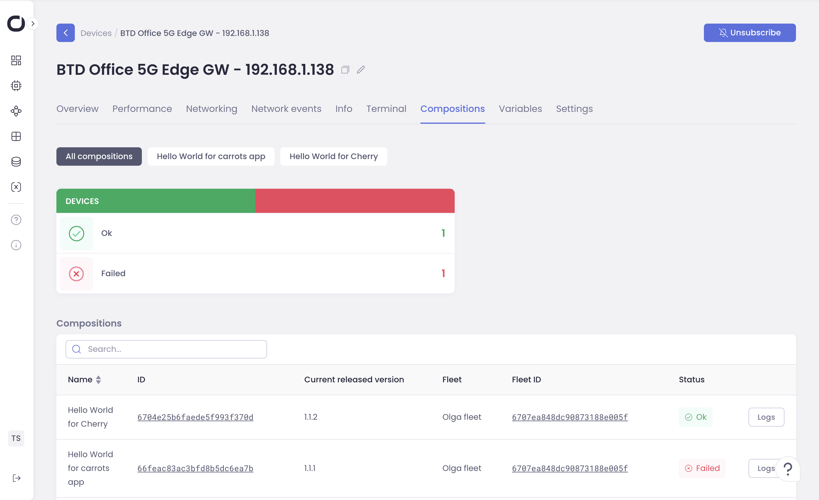 The Compositions tab lists the containerized applications (compositions) deployed to this device. From this tab, you can: